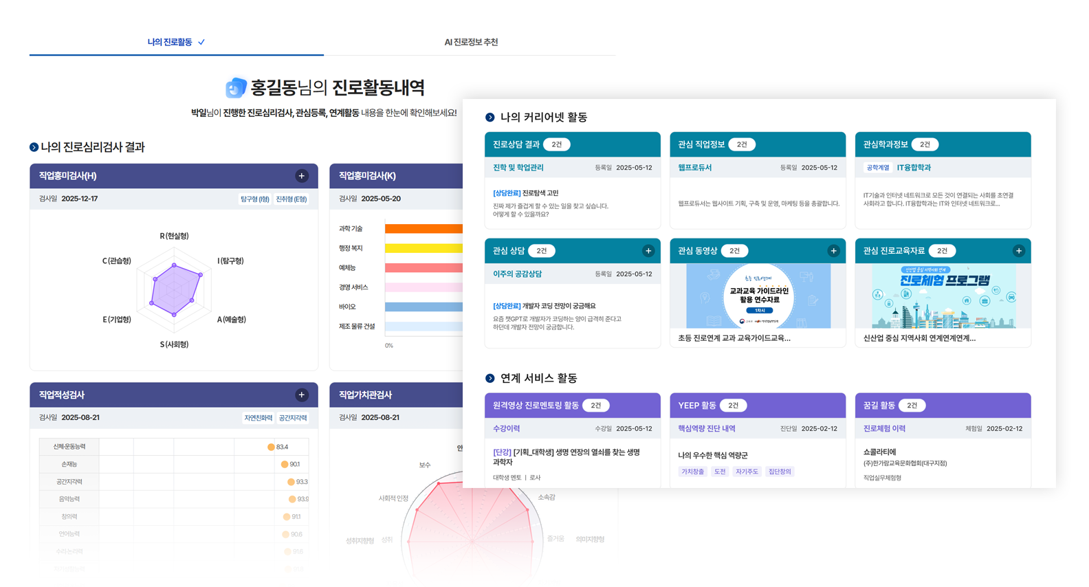 나의 진로활동 페이지에서 진로심리검사 결과, 진로상담 결과,
