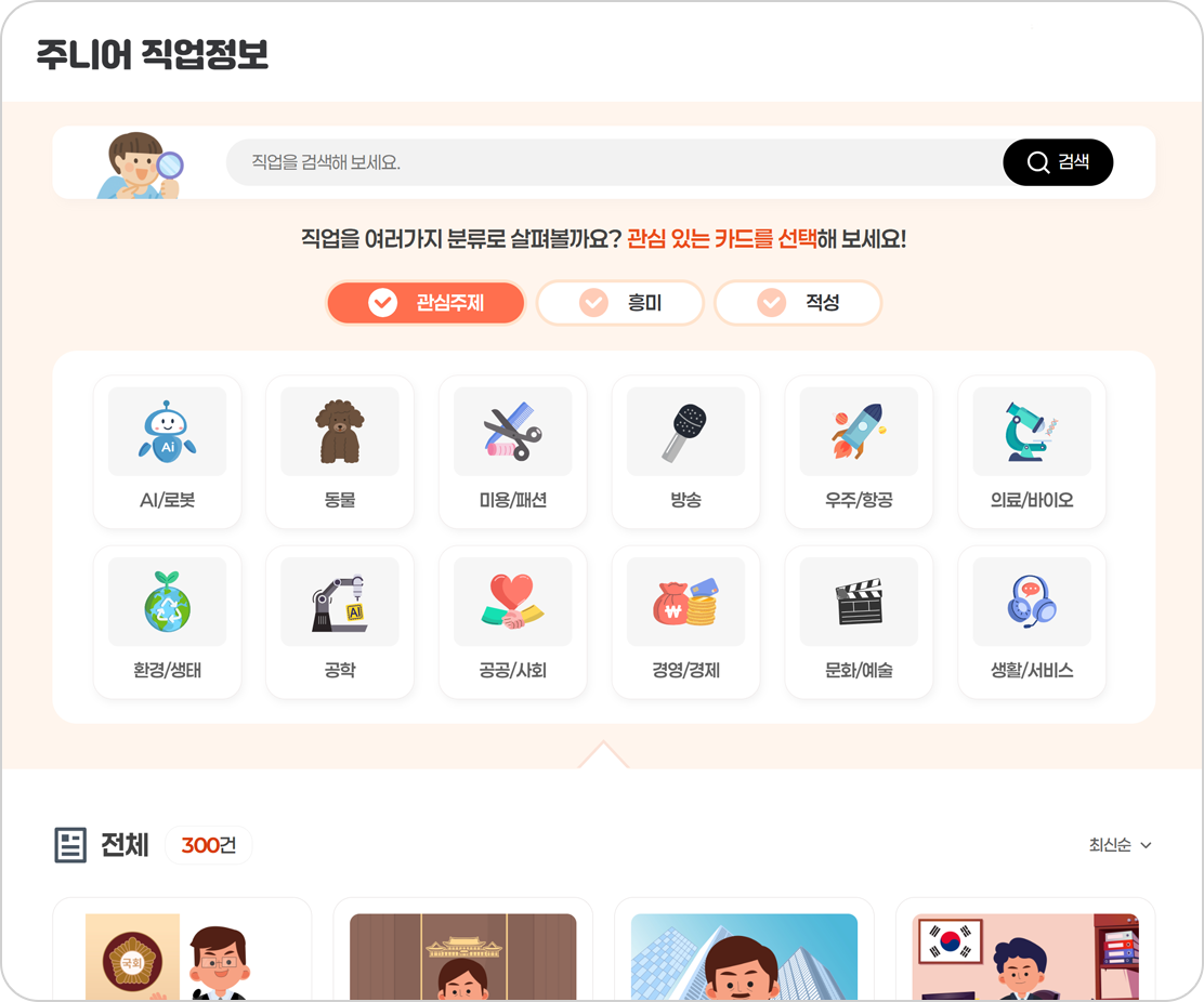 직업 정보가 300개로 늘어났어요! 유형별로 검색해 보아요.